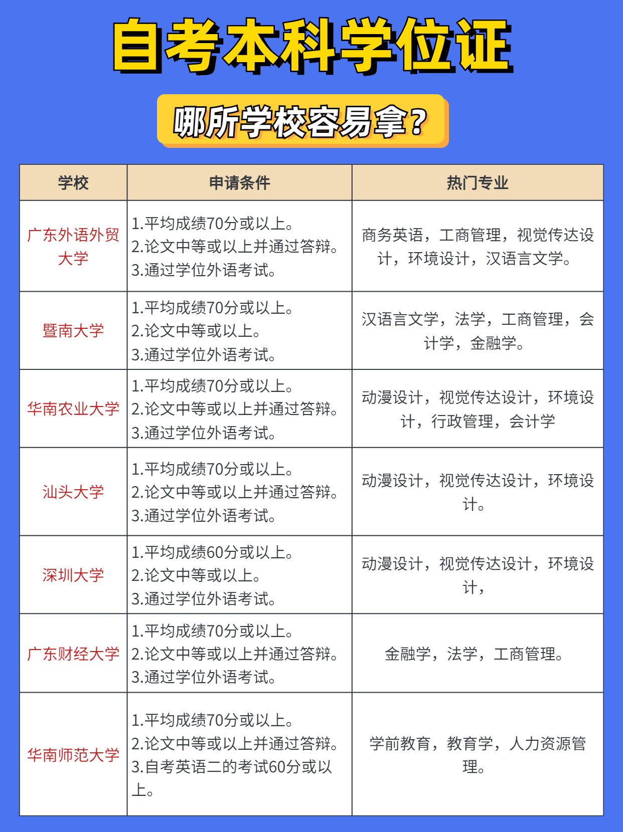 ✅其中汕头大学和深圳大学的学位证要求比较低一些,如果基础不好的姐姐妹妹们,又想拿自考学位证,可以考虑这俩所学校。基础好的同学可以选择其自己喜。
